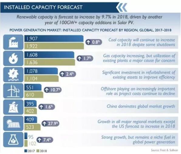 與2017年類似,Frost&Sullivan預計太陽能占投資的大部分,預計2018年為1230.3億美元,中國將成為主要投資方。太陽能和風能(海上)的需求和投資環境呈現出積極的態勢。