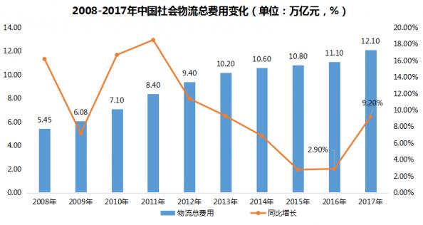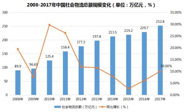 2017年,全國社會物流總額252.8萬億元。中國社會物流總額逐步擴張的同時,現代物流產業的發展速度和專業化程度不斷提升,中國社會物流效率有所改進,物流市場環境不斷轉好。