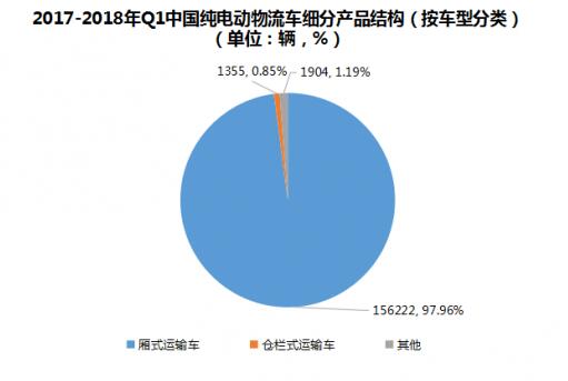 2017-2018年Q1純電動廂式運輸車累計產量15.6萬輛,占比高達97.96%;其次是倉欄式運輸車,2017-2018年Q1累計產量為1355輛,占比0.85%。廂式物流車占有絕對優勢地位,未來仍是市場的主要需求車型。