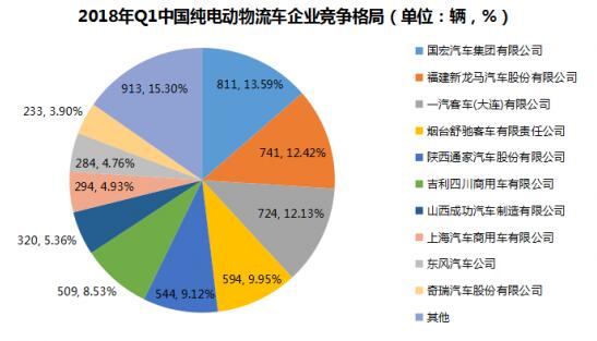 2018年一季度,中國純電動物流車市場領先企業包括國宏汽車、福汽新龍馬、一汽客車、煙臺舒馳、陜汽通家、吉利商用車、山西成功、上汽商用車、東風等企業。其中前十家企業生產5054輛,占比84.7%。