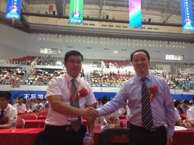 施耐德電氣公司事務及可持續發展部總監閻新華(右)與福安市副市長藍和鳴(左)握手致意