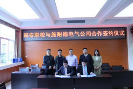 施耐德電氣(中國)工業事業部戰略和業務發展部經理陳斌(前排右)與福安職業技術學校校長李成文(前排左)簽署合作協議