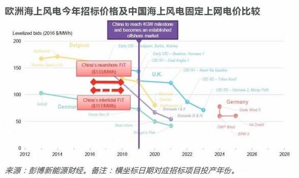 作為一個(gè)相對(duì)新興的技術(shù),海上風(fēng)電目前度電成本仍居高不下,短期大幅降低度電成本的可能性較小。但根據(jù)我們對(duì)歐洲市場(chǎng)的經(jīng)驗(yàn)總結(jié),當(dāng)一個(gè)市場(chǎng)的海上風(fēng)電累計(jì)裝機(jī)容量達(dá)到3-4GW左右,其相對(duì)成熟的產(chǎn)業(yè)鏈以及累積的項(xiàng)目經(jīng)驗(yàn)將快速推動(dòng)海上風(fēng)電度電成本下降。我們預(yù)計(jì)中國(guó)市場(chǎng)將在2019-2020年間將會(huì)達(dá)到這個(gè)臨界點(diǎn),屆時(shí)可能可以實(shí)現(xiàn)海上風(fēng)電成本及招標(biāo)價(jià)格快速下行。