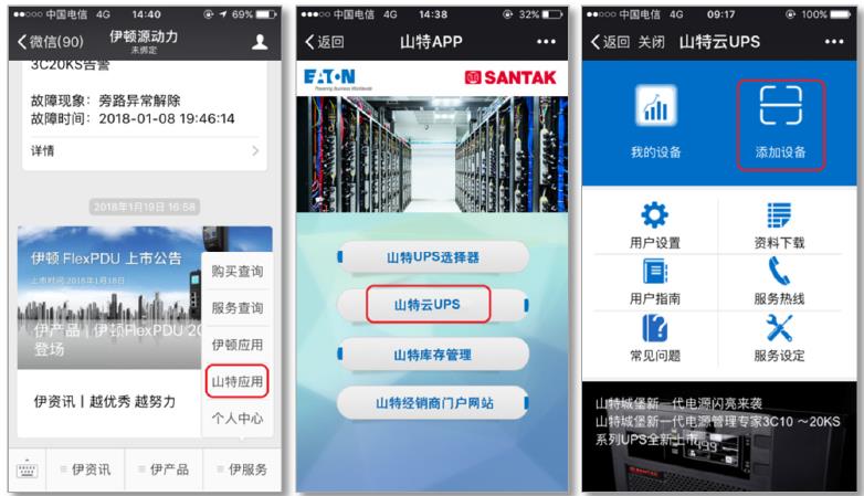 Winpower Cloud方案目前適用于山特城堡1K、2KS、6K、10KS、3C15KS、3C20KS、RACK 2K、RACK3KS、C10K RACK、C6KS RACK等機型。進入微信公眾號“伊頓源動力”,選擇菜單欄“伊服務-山特應用-山特云UPS”,點擊“添加設備”將手機攝像頭對準UPS 背面 Winpower Cloud Card 片二維碼,掃描UPS 背部序列號標簽上的一維碼 xxxxxx-xxxxxxxx,確認添加設備。設備添加成功后,跳轉到產品信息頁面,可顯示UPS 名稱、位置、型號、序列號和UPS 基本信息。用戶也可在設備列表中查看當前設備的實時狀態,進行各種功能性操作。