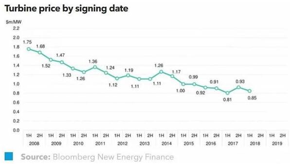 自2009年上半年以來,風機價格下降了52%,從每兆瓦183萬美元跌至2018年上半年的88萬美元。平準化價格從2009年上半年的839美元每兆瓦時每年下降了67%,至2018年上半年的276美元每兆瓦時每年。