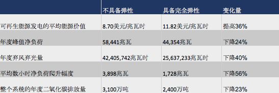 需求彈性不僅可以使需求更好地匹配波動(dòng)性的能源供應(yīng),還能夠以比僅依靠燃?xì)怆姀S綜合成本更低、碳排放更少的系統(tǒng)來平衡可再生能源并滿足峰值負(fù)荷需求?傮w來看,在模擬系統(tǒng)中利用需求彈性能夠每年避免大約20億美元的發(fā)電成本,并減少1/5的二氧化碳排放。這一量級(jí)的彈性需求還能夠減少40%的可再生能源棄風(fēng)棄光,降低24%的凈負(fù)荷峰值(總負(fù)荷減去可再生發(fā)電),并減少56%的數(shù)小時(shí)負(fù)荷爬升(“鴨子曲線”)平均幅度。