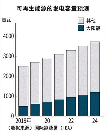 國(guó)際能源署預(yù)測(cè)稱(chēng),可再生能源的發(fā)電容量將以年率7%的速度增加,到2024年達(dá)到3721吉瓦(GW)。比2018年增加1220吉瓦,增加量相當(dāng)于美國(guó)現(xiàn)在的總發(fā)電能力。