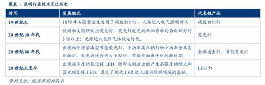 電氣光源的發(fā)展從19世紀(jì)末期開始至今已經(jīng)經(jīng)歷了上百余年,經(jīng)歷了四個(gè)不同發(fā)展階段,每個(gè)階段都有新的突破,各階段主要代表性產(chǎn)品分別是白熾燈、熒光燈、鹵素?zé)艏肮?jié)能燈、LED燈。各個(gè)階段代表性照明產(chǎn)品各有優(yōu)劣勢,但照明行業(yè)整體朝著環(huán)保節(jié)能的方向發(fā)展。
