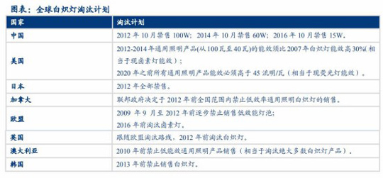 在各類照明產(chǎn)品中,白熾燈歷史悠久,使用范圍廣闊,但由于其通過物質(zhì)輻射發(fā)光,能量轉(zhuǎn)換效率(即光效)較低,世界各國已陸續(xù)明確了淘汰白熾燈的時(shí)間表。其中,歐洲、澳大利亞、日本、美國等國淘汰計(jì)劃啟動相對較早,而我國發(fā)改委于2011年11月正式發(fā)布白熾燈淘汰路線圖,計(jì)劃到2016年全面禁止白熾燈的進(jìn)口與銷售。