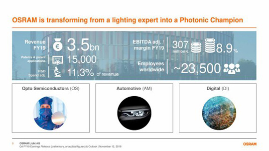 今年11月,歐司朗發(fā)布了2019財(cái)年全年可比收入下降13%至約35億歐元。總體而言,業(yè)務(wù)呈現(xiàn)下滑趨勢。