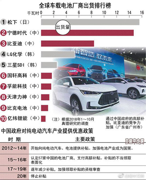 “中國最近的(純電動汽車相關)政策向淘汰技術實力低下企業的方向轉變。必須在(2020年的)補貼制度取消之前進一步提高競爭力”,一名比亞迪的高管透露出危機感。比亞迪在全球車載電池市場上份額排在第3。