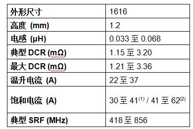 日前發布的器件頻率范圍高達5MHz,特別適合用于DC/DC轉換器能量存儲,以及電感器自諧振頻率(SRF)以下大電流濾波(參見下表)。應用包括筆記本電腦、臺式電腦以及服務器;薄型大電流電源和濾波器;以及分布式電源系統的DC/DC轉換器。