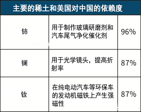 2018年美國進口的稀土(包括化合物)為1萬8557噸,來自中國的進口占到8成。美國貿易代表辦公室(USTR)在將制裁對象擴大至幾乎全部中國產品的“第4輪”額外關稅中也將稀土除外。例如用于玻璃研磨劑等的鈰,對華進口依存度達到96%,嚴重依賴中國。