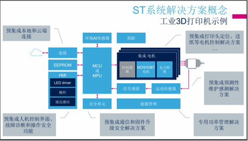 ST工業(yè)3D打印機(jī)示例:在中央部分,ST有微控制器,而旁邊還有ST的集成電機(jī)以及包括傳感安全單元和能源管理。對(duì)于ST來(lái)說(shuō),得益于其專有的技術(shù)和解決方案,意法才能為客戶提供工業(yè)3D打印機(jī)實(shí)時(shí)解決方案。