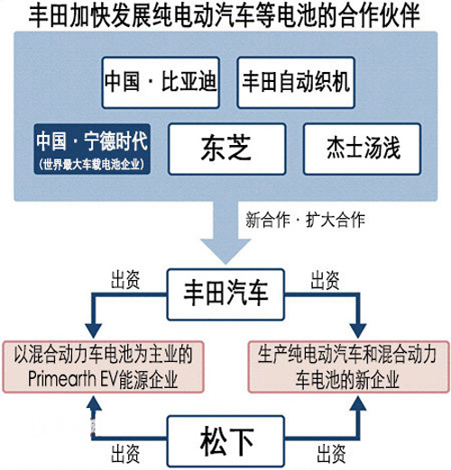 豐田將在商品化方面起步晚的純電動汽車(EV)領域發動反擊。豐田6月7日宣布,與車載電池領域世界最大企業中國寧德時代新能源科技(CATL)、比亞迪(BYD)、東芝、杰士湯淺(GS Yuasa Corporation)和豐田自動織機展開合作。為了擴充純電動汽車的產品線,將增加供應企業。在作為核心零部件的電池領域組建企業聯盟,追趕在純電動汽車領域領跑的德國大眾等。