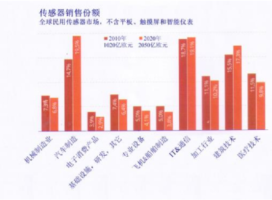圖2:全球細分領域傳感器銷售份額變化情況(來源:德國傳感與測量技術協(xié)會《傳感器技術2022》研究報告)