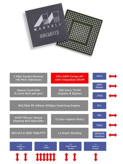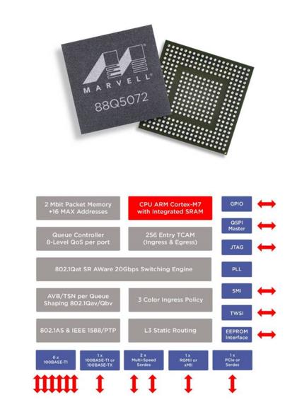 Marvell車載交換機芯片基于Arm®Cortex-M7架構,能夠在交換機上實現高級協議和安全軟件的部署,不必使用外部主機處理器。