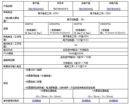 東芝最新開發的600V TB67B000AHG驅動器IC與現有的500V TB67B000HG引腳兼容,可以輕松替換。此外,東芝還在開發更緊湊的“TB67B000AFG”版本,采用小型34引腳HSSOP[1]封裝,該產品將于2019年11月上市。