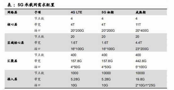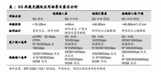 據中國電信的方案設計顯示,5G 前傳網絡(AAU/RRU 與 DU 之間)若以光纖直驅為主,對應 25G/50G 的光模塊;中傳網絡(DU 與 CU 之間)以環網結構為主,對應 100G/200G 的光模塊;回傳網絡(CU 與 CN 之間)采用環網或全互聯結構,對應 200G/400G 的光模塊。100G/200G/400G 的技術將在傳輸網中得到更為廣泛的應用以滿足更高的速率和時延指標。
