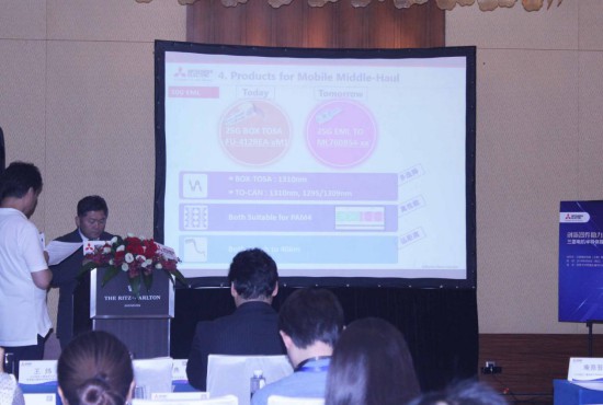 而據三菱電機高頻光器件制作所總經理宮崎泰典介紹,前傳的數量最多,大多數傳輸距離較短,三菱電機提供了25Gb/s的直接調制DFB激光器。激光器波長可以支持標準單波長的1310nm和BIDI用的1270nm/1330nm。前傳在20km左右的波分復用環型網絡形態的用途中,三菱電機提供了可以進行長距離傳輸的EML TOCAN產品。在波分復用通信中,三菱電機可以提供10Gb/s 窄波長間隔的DWDM產品群以及25Gb/s 特定波長的LAN-WDM產品群。