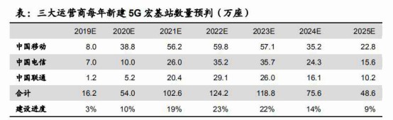 我國4G 建設周期為 2013-2018 年,參照4G基站建設進度,而根據預判5G 的建設周期為 2019-2025 年,2021-2023 年為建設高峰期。