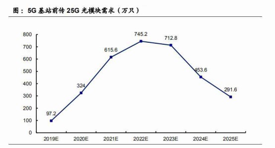 根據上述假設,則基站側對 25G 光模塊的需求將超過 3200 萬只,數量非常可觀。2021-2023 年三年建設高峰期,每年新建的宏基站超過 100 萬,頂峰時期每年僅前傳光模塊需求超過740 萬只。