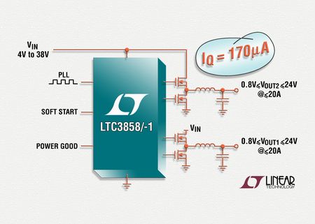 凌力爾特公司 (Linear Technology Corporation) 最新推出低靜態電流、兩相雙路輸出同步降壓型 DC/DC 控制器 LTC3858/-1。該器件在一個輸出有效時僅消耗 170uA 電流,而兩個輸出都有效時消耗 300uA。兩個輸出都關斷時,LTC3858/-1 僅消耗 8uA,非常適用于汽車和筆記本電腦應用。LTC3858/-1 的 4V 至 38V 寬輸入電源范圍能夠針對負載突降和冷車發動情況所常見的汽車寬輸入電壓瞬變提供保護作用,并涵蓋多種電池化學組成。輸出電流高達 20A 時,每路輸出均可設置成 0.8V 至 24V,效率可高達 95%。LTC3858/-1 適合為導航、音頻、通信、CD/DVD 播放器、磁盤驅動等高性能系統供電。