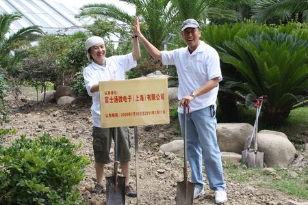 富士通微電子亞太區(qū)首席執(zhí)行官石豐瑜先生(右)和員工代表將公司紀(jì)念牌植入認(rèn)養(yǎng)的樹(shù)木旁邊