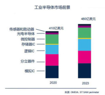 工業(yè)半導(dǎo)體市場(chǎng)前景廣闊。數(shù)據(jù)顯示,包括傳感器和致動(dòng)器、光電半導(dǎo)體、微控制器、存儲(chǔ)器IC、邏輯IC、分立器件以及模擬IC在內(nèi)的全球工業(yè)半導(dǎo)體,2020年市場(chǎng)規(guī)模為410億美元,預(yù)計(jì)到2023年將會(huì)增長(zhǎng)至480億美元。