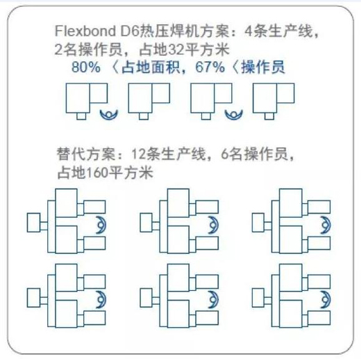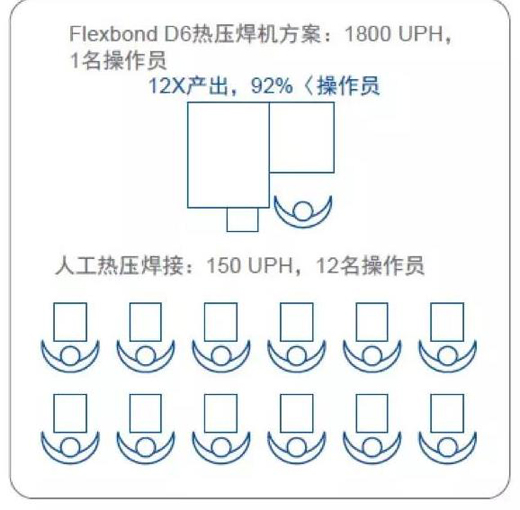 若廠家采用其他熱壓焊接方案,則FlexbondD6熱壓焊接機每小時1,800件的產出,是其他方案的3倍。所以,以同等產出計算,4條FlexbondD6生產線,能替代其他方案的12條生產線,操作人員也從6名減至2名,減省了67%的人手。