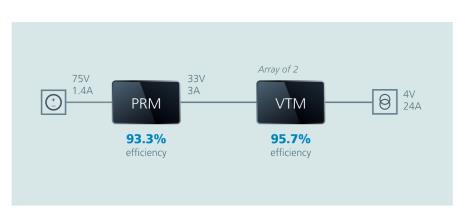 PRM升降壓穩壓器在寬輸入電壓下工作,采用零電壓開關(ZVS)拓撲,可實現極高的效率和功率密度。此外,PRM還可輕松并聯,實現更高的功率。VTM是一款電流密度很高的固定比率(非穩壓)諧振轉換器。PRM與VTM可緊密協同工作,PRM嚴格調節珊瑚礁所需的電壓,而VTM則可處理降壓轉換以及為電極提供的電流。