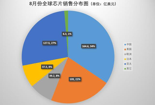 數據顯示,8月全球半導體銷售金額達471.8億美元,創歷史新高紀錄,較7月再增加3.3%,較去年同期增加29.7%。而在這471.8億美元的銷售中,中國市場排名全球第一,銷售額為164.6億美元,占全球34.4%,為全球最大半導體市場,月增3.4%,同比去年增30.8%。接著是美國,8月份的銷售金額為103億美元,占全球總銷量的21.5%,較7月增加4.9%,同比去年增30.6%。