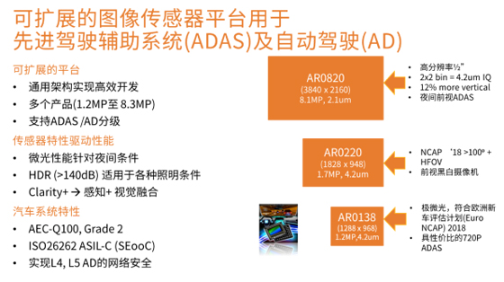 安森美這可擴展的圖像傳感器系列包含從130萬像素到830萬像素的多款產品,具有卓越的微光性能和>140 dB的高動態范圍,Clarity+實現感知+視覺的融合,且都符合AEC-Q100車規和ISO26262 ASIL-C,采用通用架構,使汽車OEM充分利用現有器件的軟件和算法,實現高效開發。其中,4.2 um的AR0138是高性價比的720P ADAS攝像頭的理想選擇,超低照,符合歐洲新車評估計劃(Euro NCAP);4.2 um的AR0220比AR0138的分辨率稍高;AR0820分辨率最高達830萬像素,適用于夜間前視ADAS和更高級別的自動駕駛。