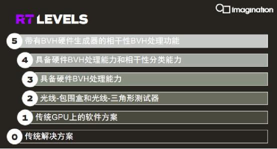 和所有領先廠商一樣,Imagination在長期的持續研發中首先總結出了一套目前業內最為完善的光線追蹤等級系統(Ray Tracing Levels System,RTLS),旨在幫助開發人員和原始設備制造商(OEM)清晰了解現在和未來可用的光線追蹤加速解決方案的功能。