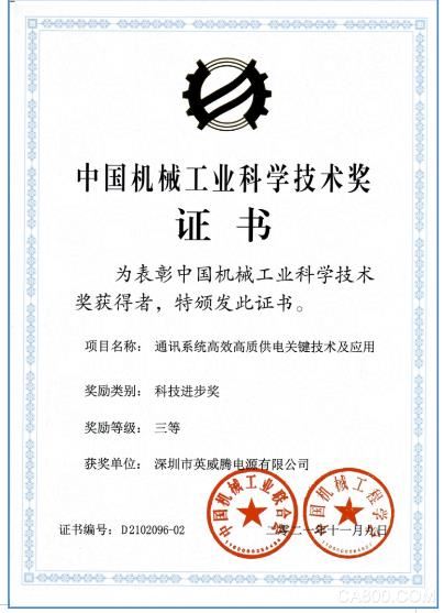 近日,2021年“中國機械工業科學技術獎”評審工作結束,由深圳市英威騰電源有限公司、深圳市英威騰網能技術有限公司參與完成的“通訊系統高效高質供電關鍵技術及應用”項目,榮獲“中國機械工業科學技術進步獎”三等獎。這是英威騰繼榮獲“中國電源學會科學技術獎優秀產品創新獎”、“深圳市科技進步獎一等獎”、“廣東省科技進步獎二等獎”以來第四次榮獲科學技術的獎項,再次彰顯出深圳市英威騰電源有限公司、深圳市英威騰網能技術有限公司強大的科研實力與創新能力,也是行業、市場對英威騰的認可和鼓勵。