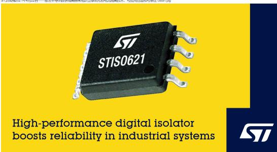 中國,2021年4月22日——意法半導體開始量產STISO621雙通道數字隔離器,該新系列高性能隔離器適合工業控制應用,可以替代普通的光耦器件。
