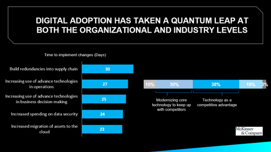 三年前麥肯錫做過調查,當時接受調查的企業(yè)高管將“成本的節(jié)約”列為企業(yè)在數(shù)字化戰(zhàn)略中優(yōu)先考量,但是現(xiàn)在有68%的高管已經(jīng)將現(xiàn)代化技術作為他們在數(shù)字化戰(zhàn)略中的競爭優(yōu)勢。所以,疫情從某種程度上來說確實是加速了數(shù)字化的轉型。