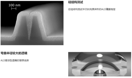ALD光學鍍膜應用方面有其獨特的優勢,原子層沉積技術適用于在三維結構的部件產品,尤其是帶有較大深寬比結構的溝槽、微孔以及復雜曲面的產品上沉積高保形、高致密、高均勻性的光學薄膜。這種特性有效地彌補了現有的PVD鍍膜技術的不足,在現代光學鍍膜領域正受到越來越多的重視。
