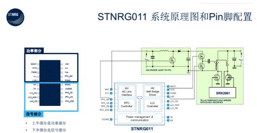 本方案采用了主流的PFC+LLC架構,主控IC是ST的STNRG011,這顆IC整合了雙端LLC諧振半橋控制器、多模式功率因數校正(PFC)控制器和運行同類最佳控制算法的數字內核。片上集成的數字外設利用ST的SMED(狀態機事件驅動)技術和專有模擬硬件,提升了控制回路的處理性能,可實現出色的動態響應。此外,STNRG011芯片上還配備非易失性存儲器,用于存儲專用參數。