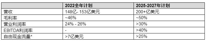 下表為與公司先前披露的2022全年營收計劃相關的財務預期,以及昨天在資本市場日會議上分享的2025-2027年新目標。