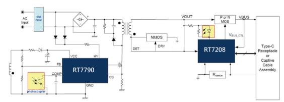 RT7790特別針對如RT7208E等控制器設計以形成支持USB PD協定或可程控電源適配器的完整電源配置。