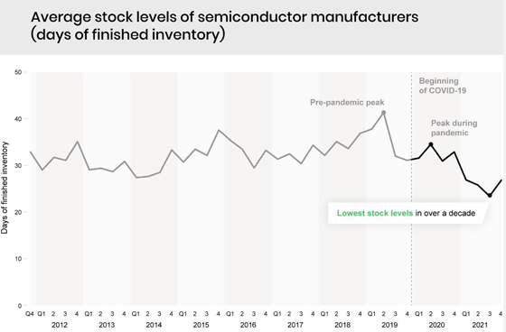 半導體制造商的庫存水平在2021年第3季度跌至10年來的最低點,在疫情期間下降了24%,與2019年第2季度的峰值相比下降了43%。一些芯片制造商持有的成品庫存已減少到3天。