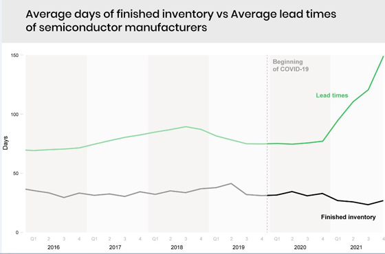 在2021年,隨著半導體需求的增加,整個供應鏈上制造商的產能無法跟上,而且他們的庫存水平下降、交貨期延長,導致汽車生產線暫停生產,使得許多汽車制造商無法完成訂單。