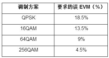 更高階的調(diào)制方案能夠在不增加信號(hào)帶寬的情況下提高數(shù)據(jù)速率,而各符號(hào)間隔更近,從而對(duì)噪聲也更敏感。隨著調(diào)制密度增加,器件需要更好的調(diào)制質(zhì)量。表1列出了3GPP Rel-16技術(shù)規(guī)范38.141中針對(duì)5G NR基站規(guī)定的誤差矢量幅度(EVM)要求。3GPP也在考慮采用對(duì)設(shè)計(jì)和測(cè)試裕量有更嚴(yán)格要求的1,024 QAM。