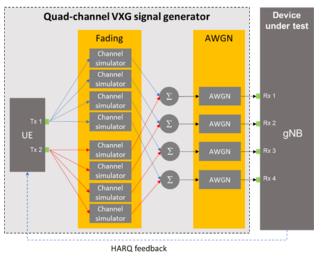圖2.使用四通道信號(hào)發(fā)生器測(cè)試5G NR基站性能的測(cè)試設(shè)置。