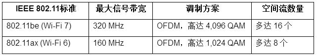 與IEEE 802.11ax相比,新一代Wi-Fi標(biāo)準(zhǔn)IEEE 802.11be(Wi-Fi 7)可提供兩倍信號(hào)帶寬、16個(gè)空間流和四倍的調(diào)制方案密度。它們共同提供高達(dá)40 Gbps的數(shù)據(jù)速率。表2列出了IEEE 802.11物理層的重大變更。