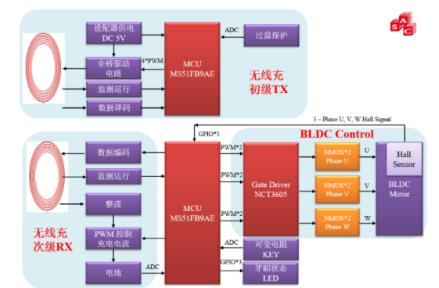 無線充RX端集成無線充電接收、電池充放電管理和BLDC電機控制三部分功能。
