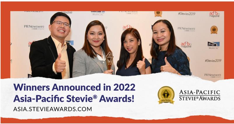 2022年4月26日-美國弗吉尼亞州費爾法克斯市:第九屆亞太史蒂夫®獲獎者公布,該獎項是唯一一個表彰整個亞太地區(qū)商業(yè)創(chuàng)新的獎項項目。金、銀、銅獎獲獎者名單請參閱:http://Asia.StevieAwards.com
