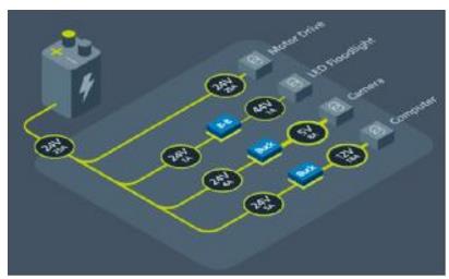 Dusty的FieldPrinter是一款電池供電的移動機器人,可在各種氣象條件下長期工作。它包括大量不同的電子設備,包括傳感器、驅動電機和電動組件、計算量很大的處理器以及一款打印機等,所有這些設備都有不同的工作電壓及電流需求。