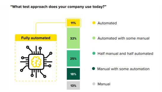 這份研究報告名為《借助自動化和人工智能(AI)征服復雜的測試》,該報告指出,自動化測試已取得一定的進展,75%的組織采用了自動化測試和手動測試相結合的方式。然而,只有11%實現了完全自動化。隨著復雜性不斷增加,測試項目也在增加(77%),如果不采用自動化方式,產品開發速度就會受到影響。
